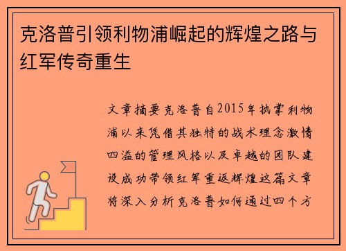 文章摘要:克洛普自2015年执掌利物浦以来,凭借其独特的战术理念、激情四溢的管理风格以及卓越的团队建设,成功带领红军重返辉煌。这篇文章将深入分析克洛普如何通过四个方面重塑利物浦的命运,重生为世界足坛的超级强队。首先,克洛普通过高强度的对抗和快速进攻战术,改造了利物浦的比赛风格,使其具备了强大的竞争力。其次,克洛普注重球员的心理建设和团队凝聚力,这使得利物浦队在关键时刻展现出强大的韧性与信念。此外,克洛普的选人和引援眼光也为利物浦注入了新鲜血液,培养出一批具有世界级水平的球员。最后,克洛普通过个人魅力和激励方法,成功打造了一个充满活力的团队氛围,为球队持续稳定的成功奠定了基础。通过这些举措,克洛普不仅带领利物浦重回巅峰,更使得“红军传奇”焕发出新的生命力。